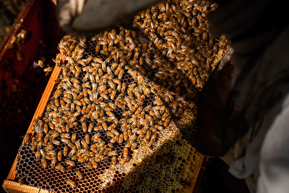「うん、しっかり残っている。これだと、よく残っている方ですね。今年の末に作った女王蜂が冬を越して、来年の採蜜群に育っていきます。(継ぎ箱を載せて2段の巣箱で移動してきた)旧王の群は単箱(一段の巣箱)に落としちゃって、来春までにほとんど居なくなるんです」