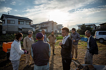 朝日が射し、手伝いの人びとが集まり始めた。画面中央が小森太平さん(手を腰にして)