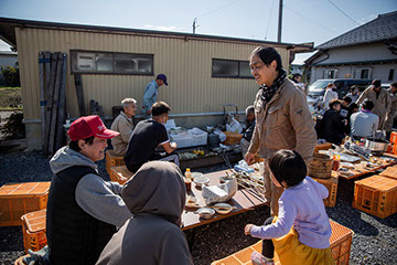 北海道から移動してきた合わせて蜜蜂950群の巣箱を設置し終えた午前10時過ぎ、小森養蜂場の駐車場で、満彦さんが腕に縒りを掛けた天然アユの炭火焼きを始め、バーベキューや鍋が提供されて手伝いの皆さんの食事会が始まった。太平さんの妻の千草(ちぐさ)さん(40)がおにぎりを配って歩いている。母親の香代子(かよこ)さん(69)も食器を片付けたり、自分の農園で育てた富有柿をお土産に持って帰ってもらうための準備をしたりと忙しそうだ。少し遅れて蜂場から帰ってきた太平さんが、手伝いに来てくれた一人ひとりに御礼の挨拶をして廻っている。