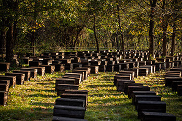 整然と設置を終えた寺内蜂場の巣箱に朝日が射す
