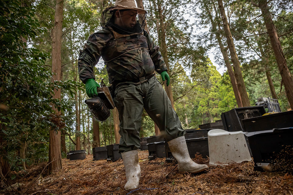 昨年12月中旬、豪雪の北海道から巣箱を移動させた蜜蜂群を知覧町で越冬させるため、杉林の中に並ぶ巣箱の内検をしながら作業の内容を説明するのは、はちみつ西垂水養蜂園株式会社の蜂場を仕切っている3代目の西垂水栄太(にしたるみず えいた)さん(27)だ。
