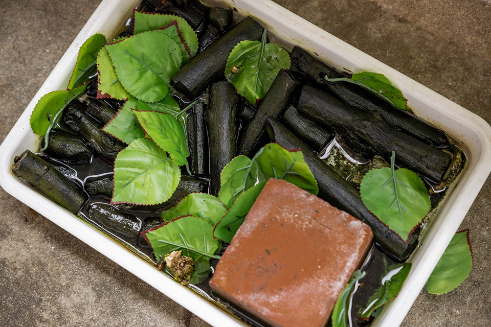 浄化を促す木炭とレンガを入れた蜜蜂の水飲み場が巣箱の前に作ってあった