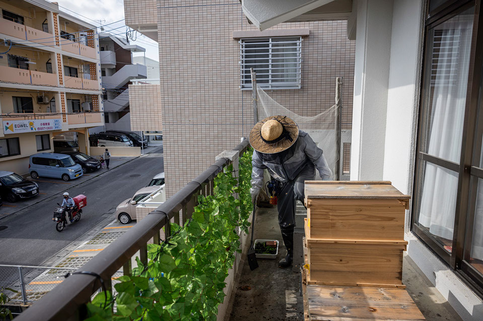 「子どもの頃から星を見るのが好きだったですね」と、あかみね養蜂の赤嶺良雄(あかみね りょうゆう)さん(69)が、広々とした1階の駐車場兼作業場で語り始めた。2階へ上がる階段下に蜜蜂5群の巣箱が置いてある。良雄さんは、この他に2階のベランダで3群の蜜蜂を飼い、合計8群の蜜蜂で住宅地養蜂を実践している。