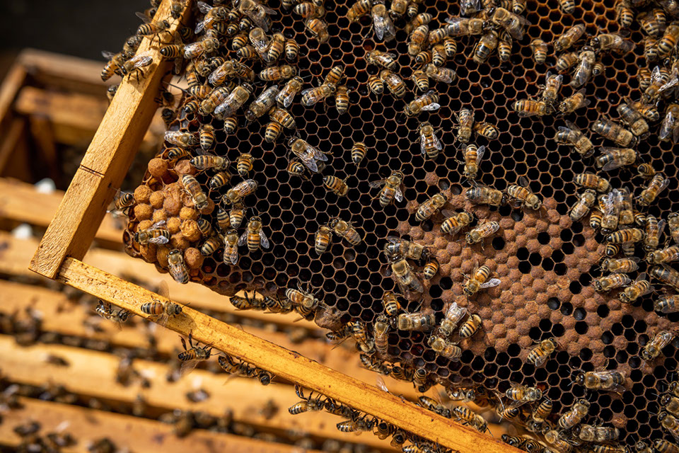 「これは教科書的ですね」と良雄さんが声に出す。雄峰のサナギが入っている突起した巣房の蓋(巣枠左隅)と働き蜂のサナギが入った平たい巣房の蓋(画面右)が同じ巣板の近くの巣房に出来ているのは珍しい。良く観察すると、サナギになる前の働き蜂の幼虫が巣房の中に見える