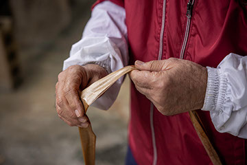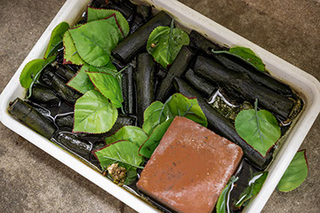 庭の隅に植えてある月桃の枯れ葉を燻煙器の燃料にする。「蜂蜜が香ばしくて美味しい」と良雄さん