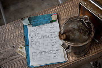 良雄さんの作業日誌。Aから始まる蜜蜂群の巣板の数や女王蜂と王台の有無、幼虫、貯蜜の状態などを記録する
