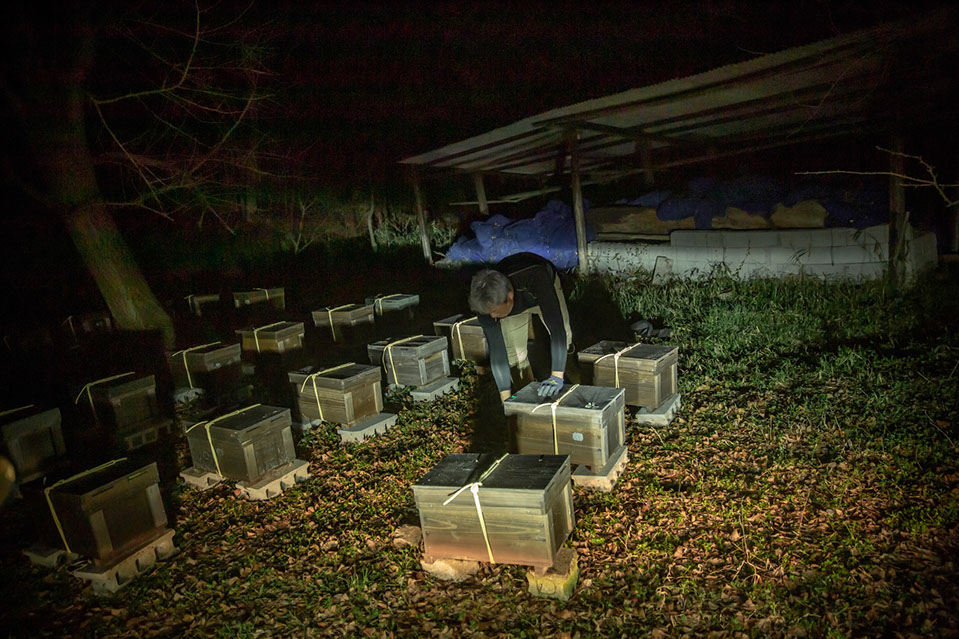 トラックのヘッドライトを頼りに大きなイチョウの木の下にコンクリートブロックを並べ、その上に巣箱を置いていく。先ほどまで周りの山の稜線は見えていたが、今ではすっかり闇の中だ。午後7時、広島県北部の三次市(みよしし)江田川之内町に拠点を置く株式会社Beemonte代表の光源寺毅寿(こうげんじ たけとし)さん(52)は、ようやく1日の仕事を終えようとしていた。