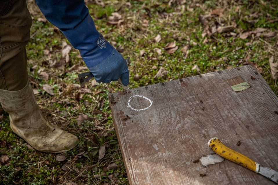 和歌山県の梅農家へ交配用として貸し出していた蜜蜂の内検をしながら、新たに出荷する群の巣箱に丸印を付けておく