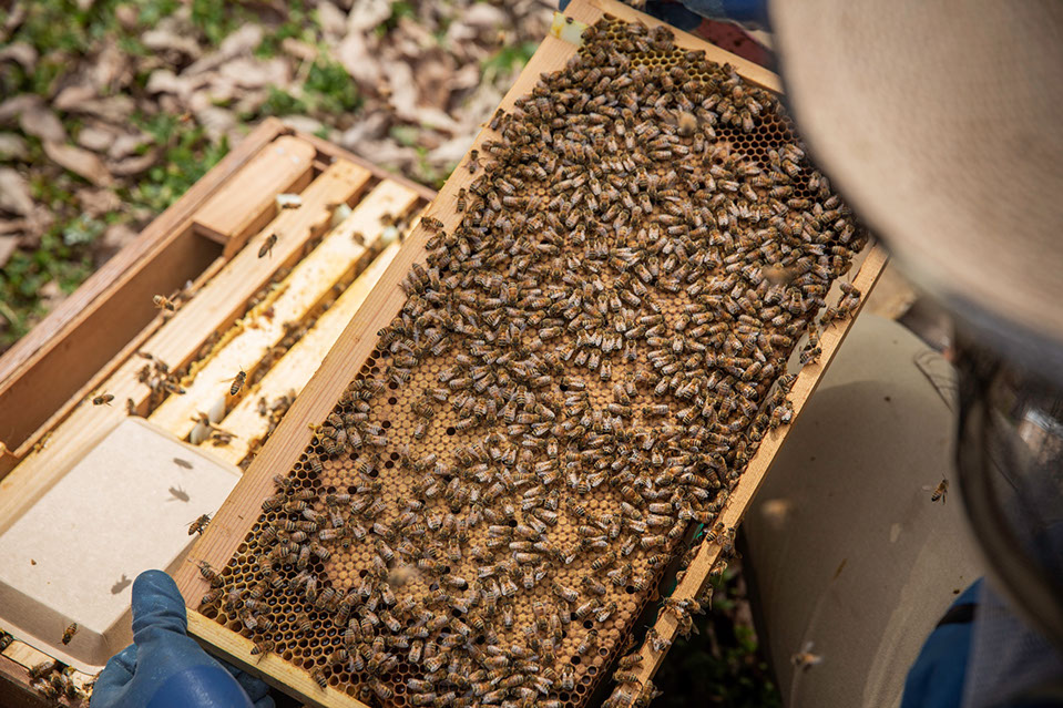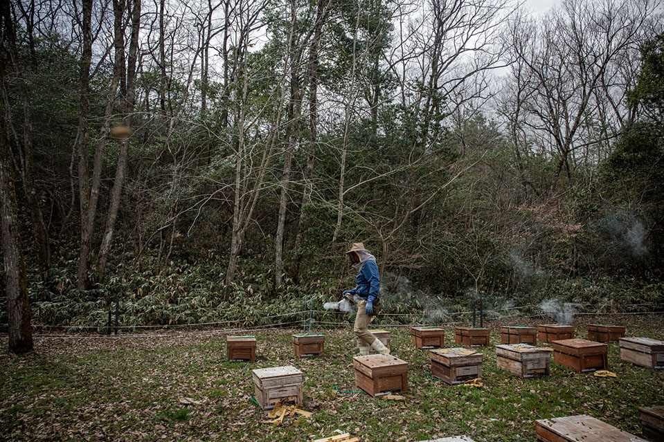 毅寿さんが内検を続けながら、私に話し掛ける。「北海道でタマネギの種を採っている会社にも交配用の蜜蜂を貸し出しているんですけどね。他の品種と交雑しないように隔絶された空間で栽培しているタマネギの種を採るのに交配用の蜜蜂を飛ばせるんですが、飛んでいる蜂の数と花に付いている蜂の数をカウンターで数えて、規定より少ないと蜂を増やして欲しいと要望されるんですよ。北海道産のタマネギの6個に1個がうちの蜂が交配した種のタマネギらしいですよ」