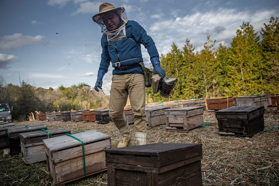 注文のあった種蜂を出荷する群を選ぶために巣箱の間を移動する毅寿さん