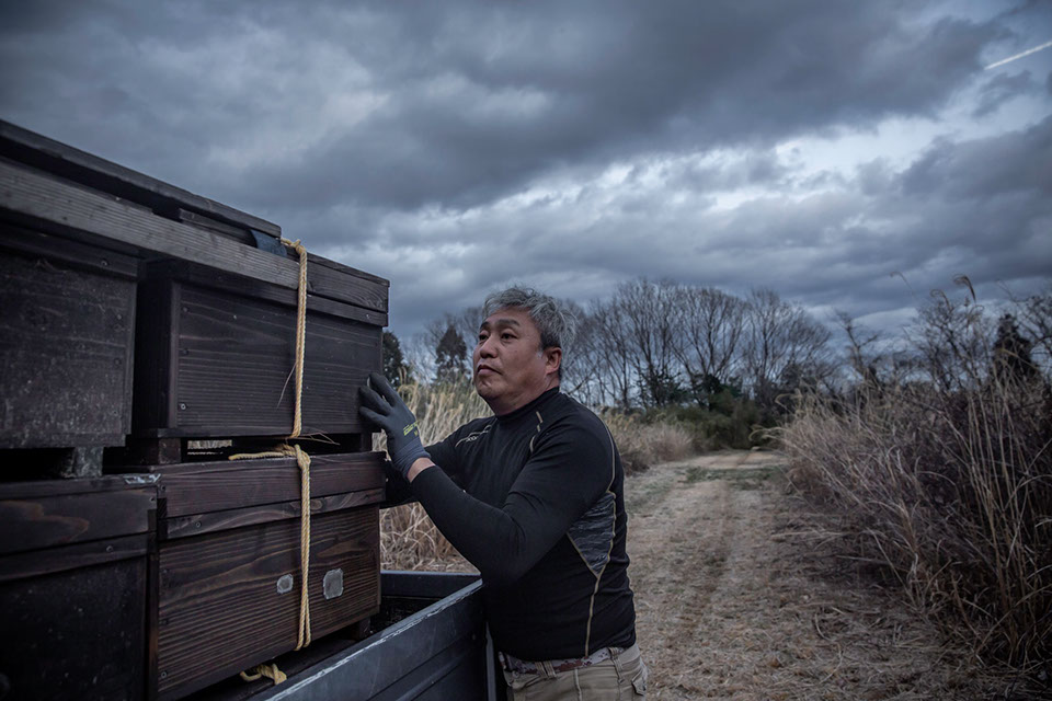 群を一か所に集めるため毅寿さんが巣箱をトラックに積み込む