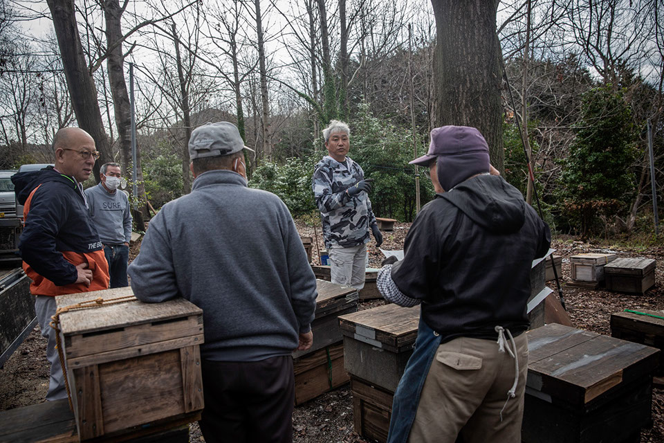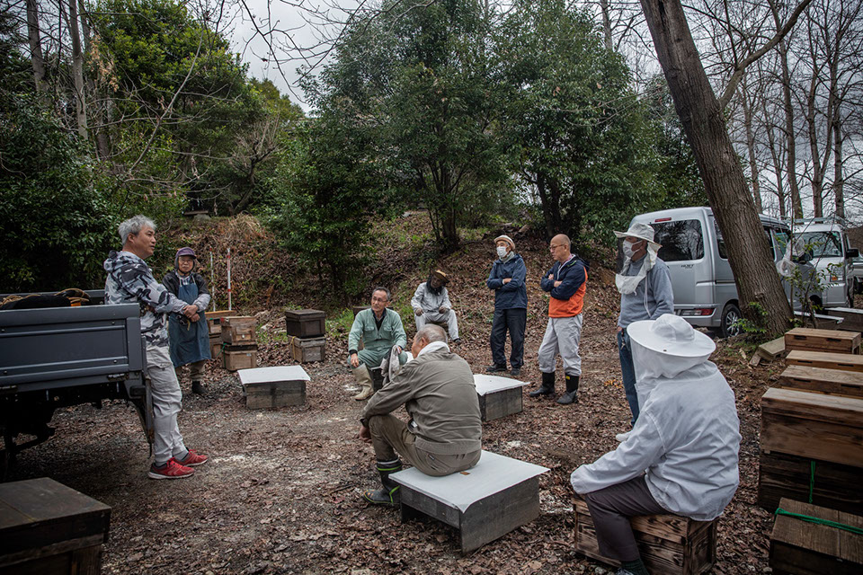 巣箱を重ねて置くと、1時間ほど待たなければならない。気は急くが、ここで急げば蜜蜂が混乱を起こす。光永さん以外は職業というより、光永さんに指導を受けながら少数群の蜂を世話している趣味の養蜂家のようだ。空はどんよりとして今にも雨が降り出しそうだ。自然と毅寿さんを囲み養蜂講座が始まった。