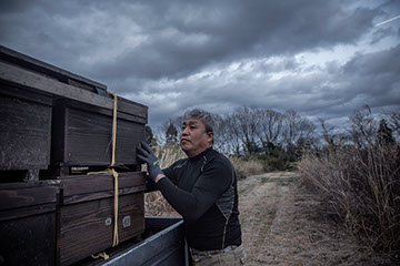 群を一か所に集めるため毅寿さんが巣箱をトラックに積み込む