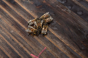 巣箱の入れ替えをしている途中から雨が降り始めた。翅を濡らした蜜蜂が飛べなくなって、巣箱の蓋の上で数匹ずつ団子になっている。趣味の養蜂家たちは自分の巣箱を入れ替え終えると、三々五々帰って行った。ビービーツリーの林の中に残った光永さんと宇多さん、それに毅寿さんの3人で、雨の中でも巣箱の入れ替え作業は終えなければならない。雨脚が少々激しくなる。3人の作業は黙々と続く。