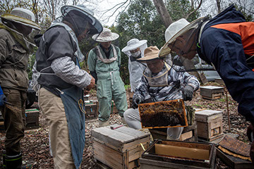 「蜂を始めた15年ほど前には、うちのお袋が『あんた暑いから寒いから言うて、よう蜂場に出掛けよるけど、蜂蜜いうんは蜂を飼うとったら勝手に採ってくるんじゃないんかね』と言いよったけど、『そんなん言わんでくれ、一所懸命やりよんじゃけん』と言うたことがあったけど……。難しいもんじゃ。(毅寿さんと)一緒に仕事しよるだけで、色々教えてもろうて……」と、宇多さんが感謝の気持ちを伝えると、毅寿さんが「蜂の仕事って地味な仕事の繰り返しですからね」と、慰めるように相づちを打つ。