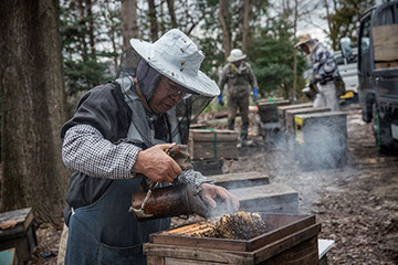 毅寿さんに運んでもらった蜜蜂の巣箱を入れ替える光永延吉さんは素手で作業をしていた