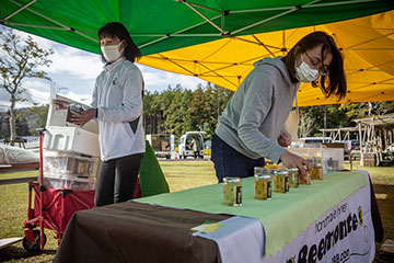 三次市農業交流連携拠点施設「トレッタみよし」で開催されたフェスタで出展準備をする長女の芽衣さん(右)とスタッフ