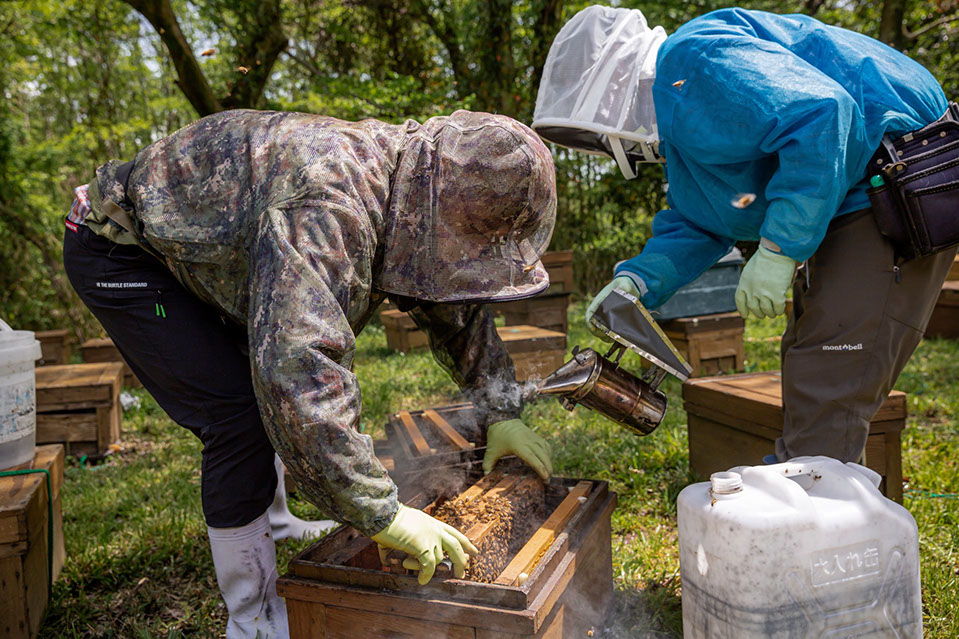 重男さんが巣板を持って合同しようとするのを有祐さんが燻煙器の煙を掛け補佐する