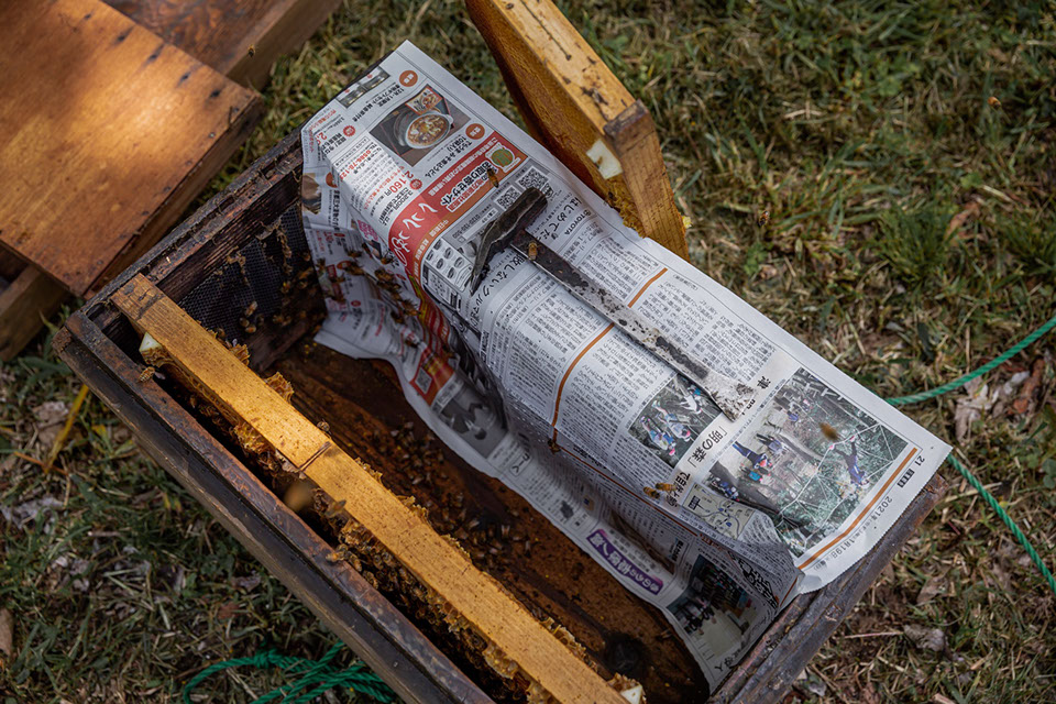 合同する群の間に小さな穴を空けた新聞紙を挟み込んでから別の群の蜂を入れる