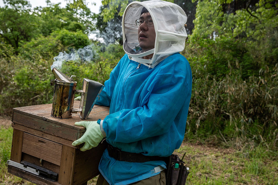 燻煙器を準備して合同作業に向かう川北有祐さん