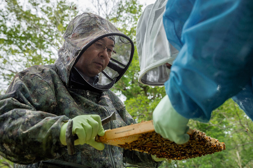 「大型トラックに巣箱を積み込むのは横5列、縦17列と決まっとるんで、交配用巣箱も含めて4種類の巣箱をいかに真四角に積むか、設計図を作るんです。温度が上がらんように外側に蜂が入っとる奴で、中には空箱。2日後に菜の花の採蜜群を下北半島で降ろしたら、一緒に積んできたカボチャの交配群を3トン車に積み替えて、夕方のフェリーに乗って北海道へ向かうんです。北海道で一週間ほど採蜜の準備なんかをしといて、下北半島に戻ったら採蜜。下北で菜の花の採蜜を終えて、秋田県の大館市に移動するのは6月の頭やな。下北半島からは自分たちで巣箱を運んで……下北から大館まではほぼ2時間やから。それから2週間がアカシアで……、大館が終わった頃、そこが一番の闘いやな。眠るのはフェリーの中、道南の茅部郡(かやべぐん)森町へ移動や。もう花が咲いとるんで、一日遅れたら大損やからな」