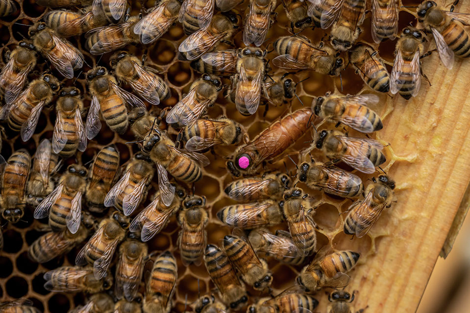 一瞬でも早く群の中に居ることを確認するためにマーキングされた女王蜂