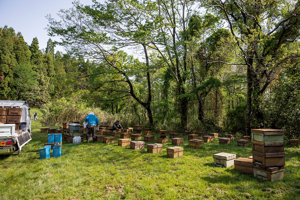 「三重県では、ここがうちのメインの蜂場なんです」と重男さん。「広場」と呼ぶ蜂場は、伊勢自動車道の高架に近く、枡形山(ますがたやま・312m)の麓にある広々とした蜂場だ。この日、重男さんと4代目の有祐(ゆうすけ)さん(37)は、三重県内のイチゴ交配から戻ってきた蜂群の合同をしていた。