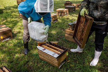 イチゴの交配から戻ってきた群を合同する際には、女王蜂を確認しマーキングすることから始める