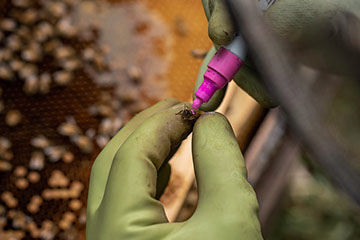 一瞬でも早く群の中に居ることを確認するためにマーキングされた女王蜂