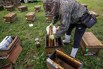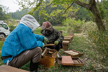 翌朝は天候が回復し、重男さんと有祐さんの合同作業と内検が「広場」の蜂場で続いた。