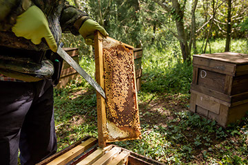 重男さんは「いかに効率良く仕事するかを、いつも考えとる」と言う。「市販で売っとる物でも自分で作って、使ってみて、蜂の道具は全般的に改良しとるんです。搾った蜜を漉す器や蜜巣板を運ぶ一輪車は、一から作りましたね。小回りが利いて軽くて、高さ的にも丁度良いサイズ。蜜巣板を縦にしたら、縦のまま採蜜を終えると効率が良いですよね。後手にならんように気を付けんと……。追い回されるのは適わんからな」
