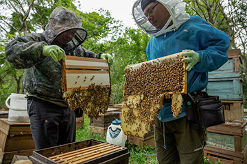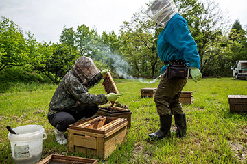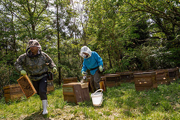 自然が季節に応じて刻々と変化するのに合わせて、蜜蜂の状態が変化し、自らの仕事が変化する時間の流れをイメージしていることが伝わってくる。「取りあえず、採れる花がある時に採る。それが鉄則やな。次の花を追い掛けて行っても、採れるとは限らんからな。蜂が良くても、花が良くても、天気には敵いません。3つ揃わんかったら話になりません。結果は天まかせや。アカシアが終わったら、僕、蜜を採らないんです。栗の花を見てしまったら、栗(の蜜)が入ってこんようにラストスパートやな」。