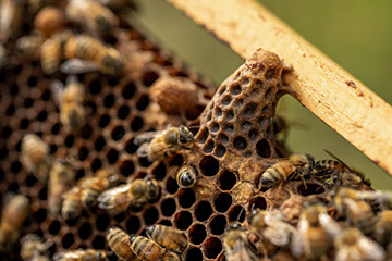 広々とした蜂場の真ん中にポツンと一箱だけ置いてあった群の内検をしている時だ。重男さんが「これ、もうすぐ王さんが生まれますよ」と、巣礎の端から突き出している王台を私に見せる。王台の上部に薄らと切れ目が確認できる。初めて女王蜂が生まれる瞬間に出会えると期待した。しかし、「もうすぐ」という時間の判断を誤っていた。「もうすぐ」は本当に「すぐ」だったのだ。その緊張感は私になく、ちょっとよそ見をした僅か数秒の間に王台の蓋が開き、女王蜂は生まれ、姿が見えなくなっていた。生命の神秘に立ち会える絶好の機会を逸してしまったのだ。