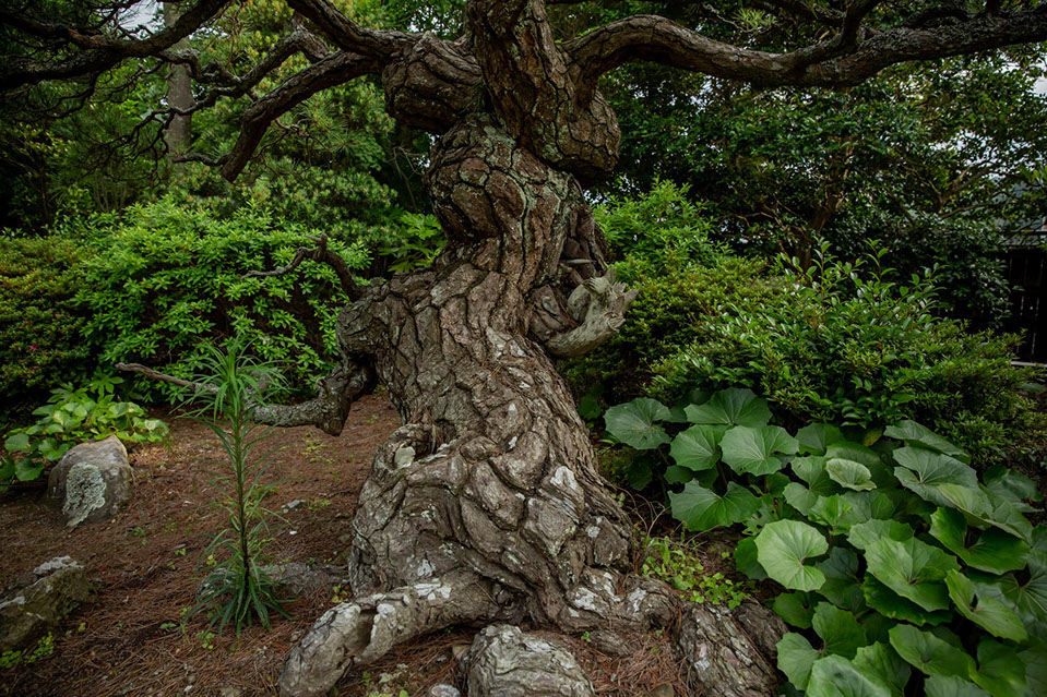 勾玉のような2つの島が細い絆で繋がった島根県隠岐諸島の一つ西ノ島の深く入り込んだ美田(みた)湾の岸辺。旧道沿いに長く続くアスナロの板塀に囲まれた屋敷の門を潜る。太い幹がうねるように斜めに伸びるクロマツを右手に見て、飛び石に誘われるまま玄関前に立つと、軒先に並べてある重箱式待ち箱3台が目に入った。手前の待ち箱には分封先を探す偵察蜂が来ているようで、数匹のニホンミツバチが巣門を出入りしている。