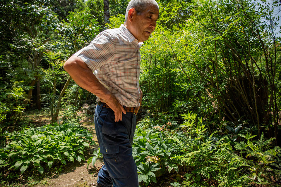 「バラの花弁を齧るんですね。ミネラルやビタミンを補給しているんだと思います。私、花栽培が好きでね。観察していると、菊も齧りますしね、葉っぱも齧りますね。ニホンミツバチは隠岐諸島の中ノ島(なかのしま・海士町)と知夫里島(ちぶりじま・知夫村)では全滅していたんです。しかし、島後(どうご・隠岐の島町)とここ西ノ島(にしのしま・西ノ島町)は、わずかですが生き残っていたんです。戦後、材木不足の時代に島が丸裸になるほど山の木を伐っていましたし、松食い虫の被害が出た時には農薬の空中散布が激しかった。樹齢250年の見事なクロマツが枯れてしまいましたからね。巨樹の洞が無くなってしまって蜂の住居不足だったんですね。木の洞や根の穴、神社の狛犬や墓の台座に野性のニホンミツバチは巣を作りますからね。昭和50(1975)年代に島のクロマツが全滅しましてね。でも、その後は気候風土に合った先駆植物が芽生えてきて、蜂の食源になっていくんです。シイ、マテバシイ、サクラ、サルスベリ、ツツジなどが芽生えて、復活は早かったです。アカメガシワやカラスザンショ、ヤブニッケイ、クリなども早かったです。それにヤツデ、ナンテンもありますね」