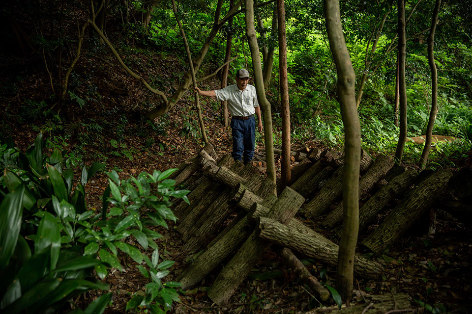 昭和元年に建った大きな家の裏は、庭というより林だ。「ここが第一ほだ場ですね。色々なキノコを作っていますよ。シイタケ、ヒラタケ、キクラゲ、マイタケもありますね。病院の看護士グループに配っています。地元に何か役に立ってほしいなと思っていましたから……」。薄暗い林の中をさらに歩く。「これはナメコです」と茂みの中に置かれてある古畳を指差す。「このメタセコイヤは樹齢4、50年ですよ」。和良さんの声で仰ぎ見ると、幹周り2抱えもありそうな巨樹が聳えている。少し進むと、落羽松(らくうしょう)の太い幹が目の前に現れた。「この木の根は膝根(しっこん)と言う呼吸根で、水の中でも育つんです」。元は池の底だった所からニョキニョキと奇妙な根が飛び出している。