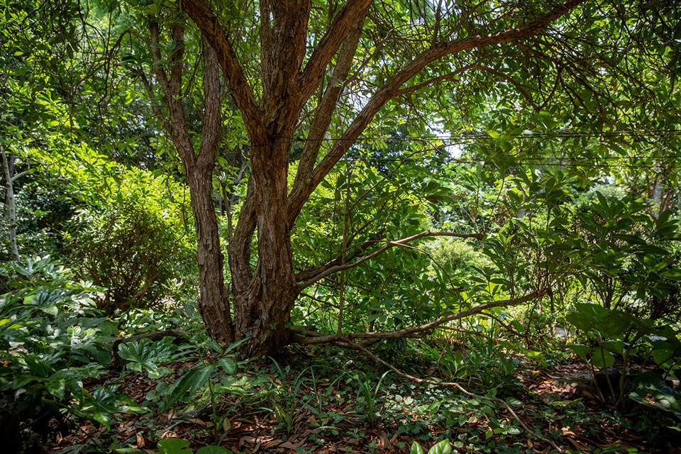 前の日、和良さんが蜂に刺された裏山の待ち箱も確認に行く。ここにも偵察蜂の姿は見えるけど、変化の兆しは見えない。裏山からの帰り道、竹林の奥に見える穴を指差して「ここ防空壕。空襲警報が鳴ると母親に連れられてここに逃げ込んでいたのを覚えていますね」と和良さん。家の横に背の高いシュロの木がある。「広島大学で社会教育主事のセミナーを受けに行った時、記念に実を拾って持ち帰ったトウジュロというシュロなんです。このビワは家内の里の種を持って来て植えたもんです。シャクナゲは長女の誕生記念だから50年になりますね。餅梅は種を残すために接ぎ木をして残した梅なんですよ。このイチジクはバナーネという世界で一番大きな実を付ける品種なんです」。シュロもシャクナゲも餅梅もイチジクも、庭の木々一本一本に曰く因縁があることに驚く。具体的な物語があるから一層深い愛着が湧くのだろう。