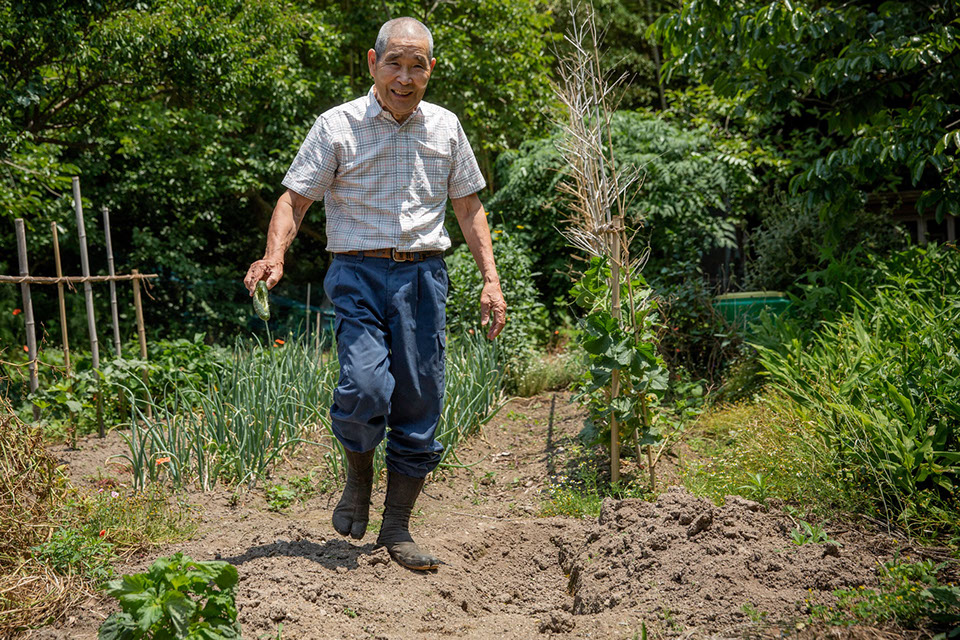 再び、和良さんの姿が見えなくなったと思っていると、「今日、食べようと思ったらカラスにやられました」とキュウリの支柱横から声がする。「キュウリもね、5回ほど苗を作るんですよ」と、皮だけを残してカラスに食べられたキュウリを手に何だか嬉しそうだ。