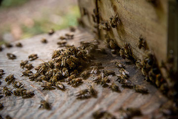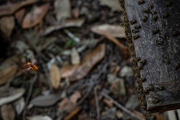 さらに茂みの奥に入る。「ここが第一蜂場です」。重箱式巣箱が茂みに3台置かれてあって、その内の2台でニホンミツバチが活動している。「ほら、熱殺していますよ。こういう時に広いステージが役に立つんです」。巣門前の板のステージに蜂球が出来ている。本来はスズメバチが蜜蜂を襲うのは秋口になってからなのだが、巣門前にはすでにスズメバチが花蜜や花粉を採って戻ってくる蜜蜂を狙ってホバーリングしている。警戒するニホンミツバチはステージの先端に並び、一斉に尻を持ち上げて翅を震わせ威嚇している。どうすれば小さなニホンミツバチがスズメバチを捕らえることができるのか、捕らえる瞬間を見たことはないが、現実に目の前で多勢で覆い被さるようにスズメバチに群がり、自らが発する熱で殺そうとしているのだ。