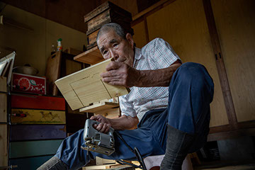 「和蜂復活プロジェクトの仲間に配るために、来年用の継ぎ箱を作っとるんです。重箱式巣箱は山口県が発祥なんですよ。箱には杉の赤身を使って、扉にはアスナロという一番腐れにくい木を使います。30年は楽に持ちます。上手くいけば50年も持ちますね。アスナロは良い匂いがするでしょう。来年用の巣箱をもうだいぶ準備していますよ。プロジェクトを始めた頃は年に30個作っていましたけどね。私が入院してからは会の集まりもしなくなりましたし、年に10箱か15箱ですね。巣箱は木裏を外に出した方が長持ちするんですけどね。そうすると、この場合は節が外へ出てしまうので、ここは逆に使おうと思うんです」