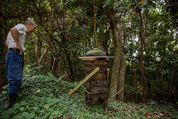 前の日、和良さんが蜂に刺された裏山の待ち箱も確認に行く。ここにも偵察蜂の姿は見えるけど、変化の兆しは見えない。裏山からの帰り道、竹林の奥に見える穴を指差して「ここ防空壕。空襲警報が鳴ると母親に連れられてここに逃げ込んでいたのを覚えていますね」と和良さん。家の横に背の高いシュロの木がある。「広島大学で社会教育主事のセミナーを受けに行った時、記念に実を拾って持ち帰ったトウジュロというシュロなんです。このビワは家内の里の種を持って来て植えたもんです。シャクナゲは長女の誕生記念だから50年になりますね。餅梅は種を残すために接ぎ木をして残した梅なんですよ。このイチジクはバナーネという世界で一番大きな実を付ける品種なんです」。シュロもシャクナゲも餅梅もイチジクも、庭の木々一本一本に曰く因縁があることに驚く。具体的な物語があるから一層深い愛着が湧くのだろう。