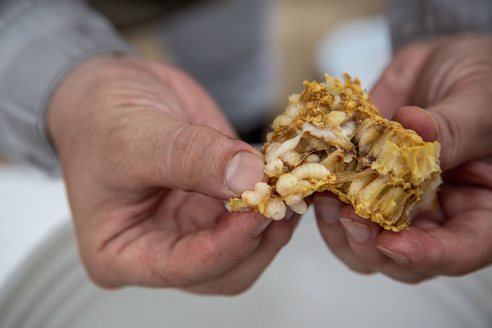 ダニを引き寄せるために準備した雄蜂を誕生させる巣板から巣房ごと幼虫を取り出してダニの有無を確認する