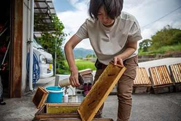 巣板にスムシが湧かないようにCERTANの希釈液を噴霧する林田さん