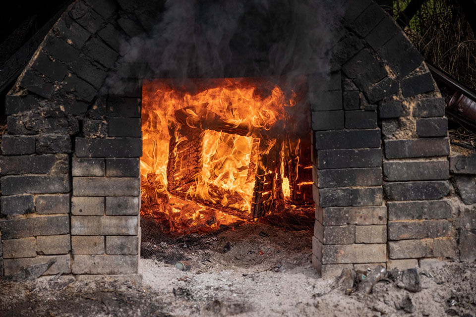 備前焼の窯で不要になった巣箱を焼却する