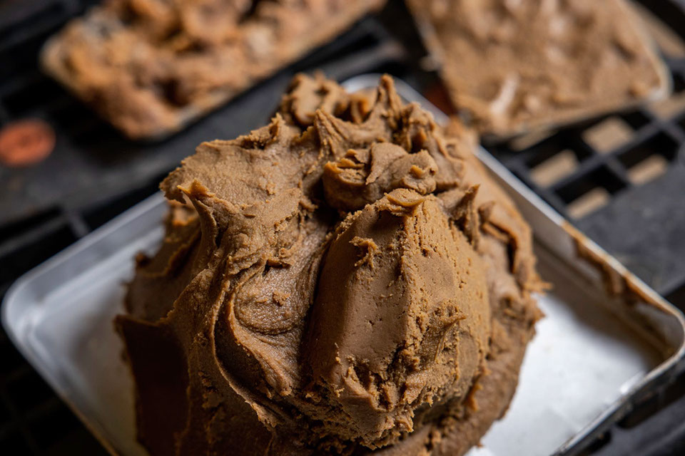 新しい土練機で練った人工花粉。「粘い粘い、こんなになるとは知らなんだ」と常雄さん