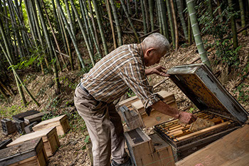 「寝とっても蜂のことを考えとるのは楽しいんですよ。昔は、餌(砂糖水)をやる銭がのうての……。蜂は催促せんから少しずつ分けてやってると、結局は足らんのですよ。そうすると蜂は無理して蜜を探しに行くんですよ。初冬から暮れに咲くビワの花に行くんですよ。雲が掛かったら体が冷えて飛べんようになるんですよ。それで、雲が通り過ぎて太陽が顔を出すと、又、暖かくなって巣箱に戻ってくるんですよ。それだけギリギリの状態で餌を採りに行ってるんですよ」