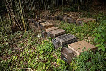 田中常雄さんが登り窯上の裏山にある竹林に囲まれた蜂場を案内しながら内検をする