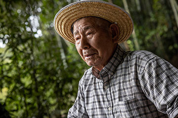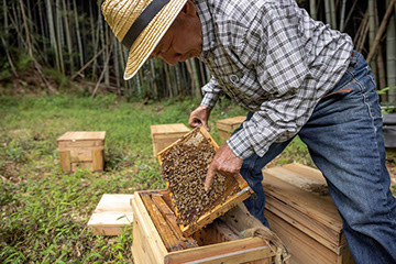 自宅裏山の蜂場で蜜蜂の働きを観察する田中常雄さん
