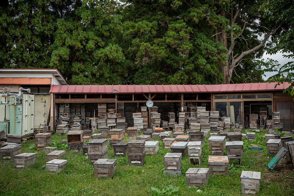 もう一つ、久雄さんが見せてくれたのは、事務所の壁に飾ってあった初代忠造さんの時代に撮影された額入りの古い白黒写真だ。刈り取られた稲株が連なる田んぼの中に巣箱が整然と並べられ、遠くに磐梯山が聳えている。まさに、現在の長嶺養蜂場横の風景で、広がる田んぼと磐梯山の聳える風景は現在もまったく同じだ。越冬のために千葉県房総半島へ移動させていた蜜蜂群が、春になり会津に戻ってきた際、会津の蜂場へ分散して置く前に田んぼを借りて仮置きした時のようだ。それにしてもすごい数の巣箱。初代忠造時代の経営規模の大きさが伝わってくる。
