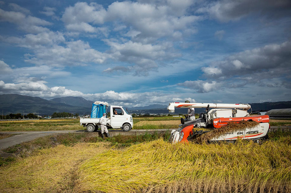 長嶺養蜂場近くの田んぼでは稲刈りの最中